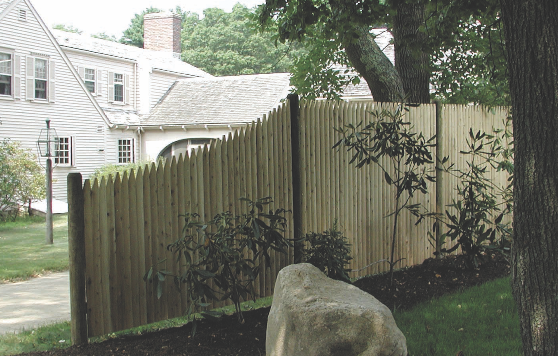 Imperial Stockade Fence F-WS-7: Imperial Stockade fencing with round pressure treated posts is a rustic style privacy fence. It is shown here with a curved transition to gracefully end this long line of fence.
