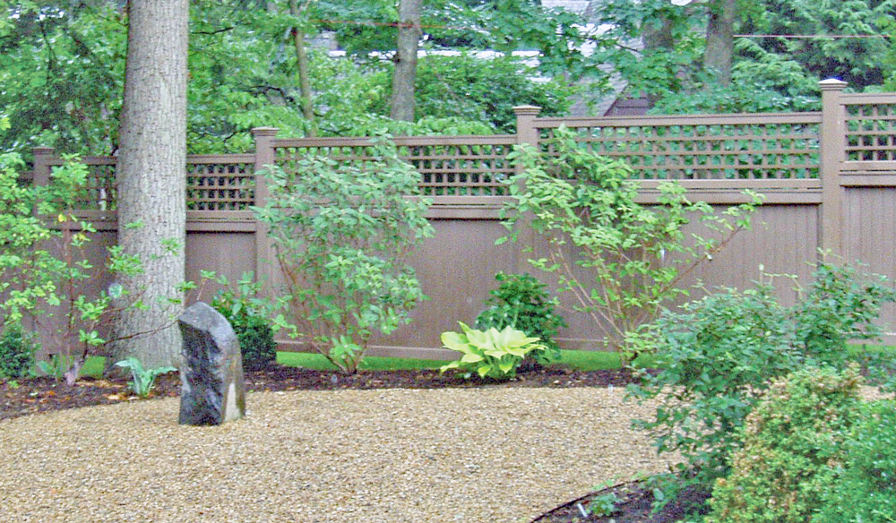 Ultra Privacy with English Lattice Topper Fence F-WP-18: The Ultra Privacy with English Lattice Topper fencing, pre-finished in a natural earth tone, is a simple, but elegant backdrop to this Zen garden.